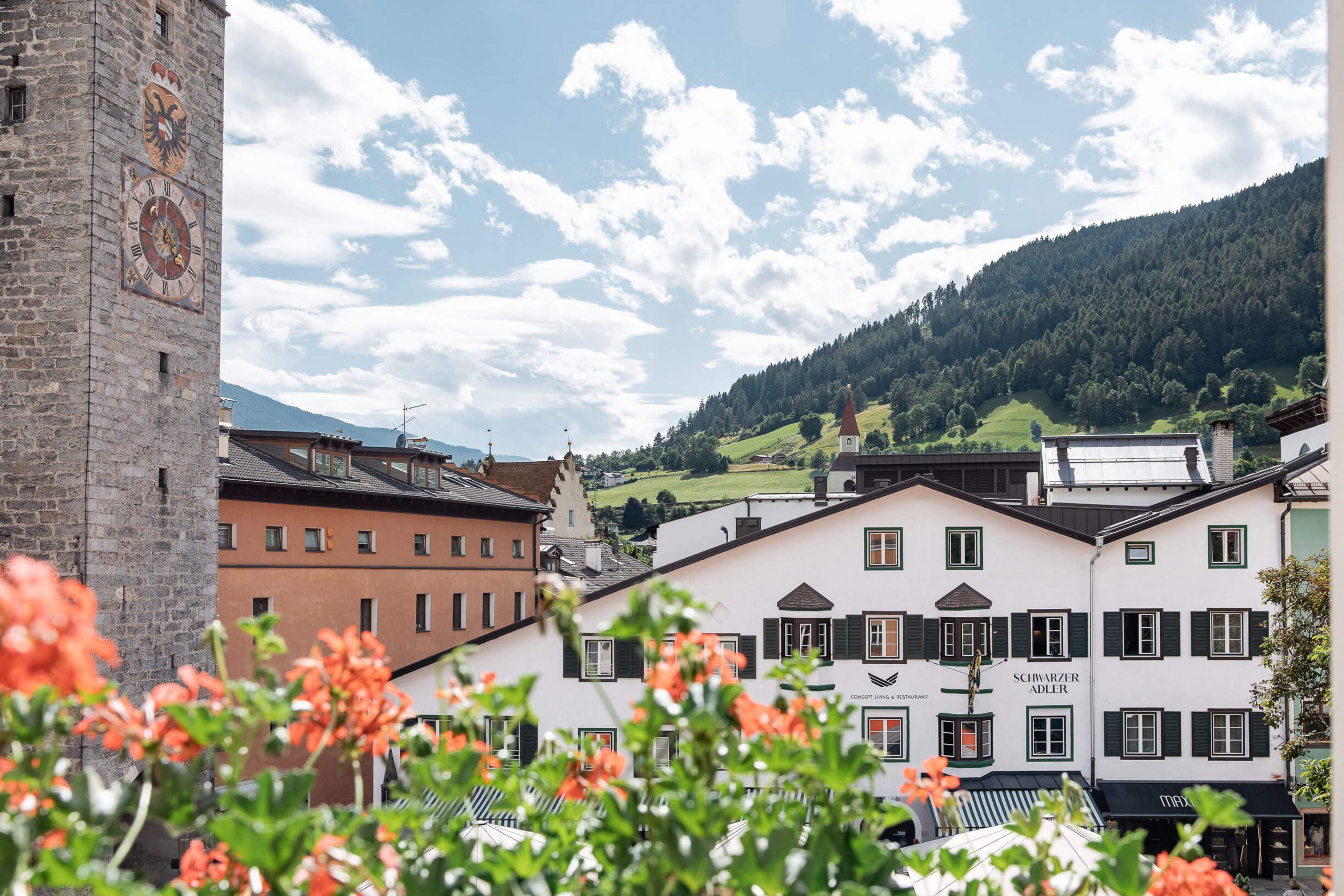 Eine Sterzinger Institution: das Hotel Schwarzer Adler. Seine Nachbarn: der Stadtplatz, der Zwölferturm, die Lauben der Neustadt. Die Quintessenz von Sterzing.