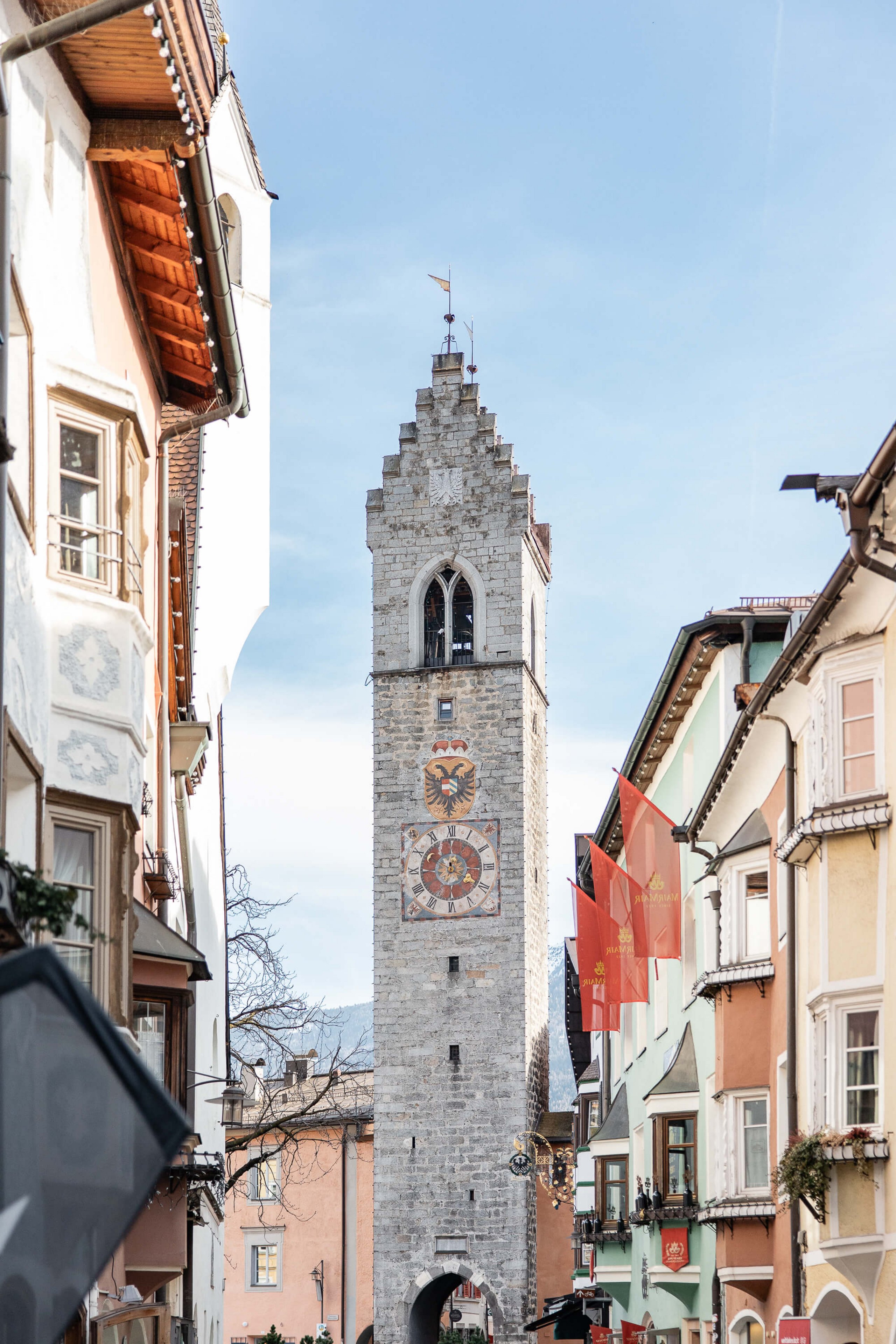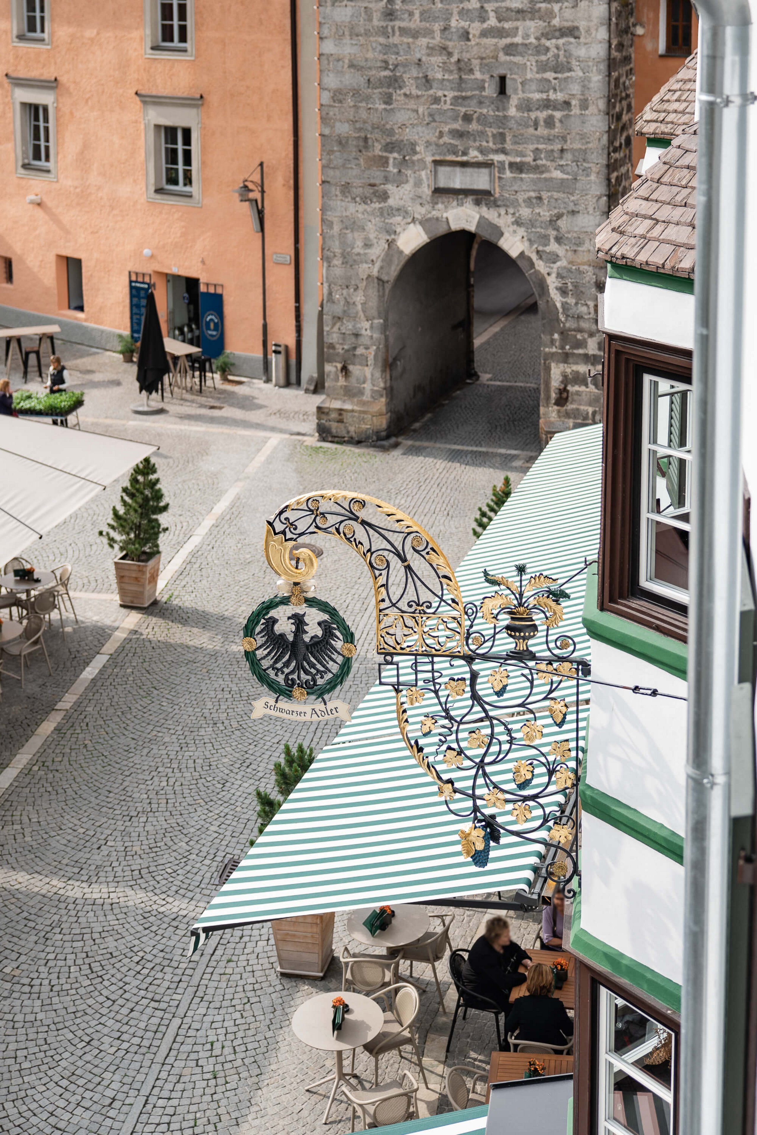 One street runs straight through the town centre from north to south. The Zwölferturm tower divides the centre of Sterzing into two halves: everything to the south of the tower is the new town, while everything to its north (including the Schwarzer Adler) belongs to the old town. When you’re strolling through the town, lift your eyes from time to time to admire the artistic signs of the shops in the new town. Along with the colourful façades of the houses, they’re the characterising features of the town – and are truly charming.