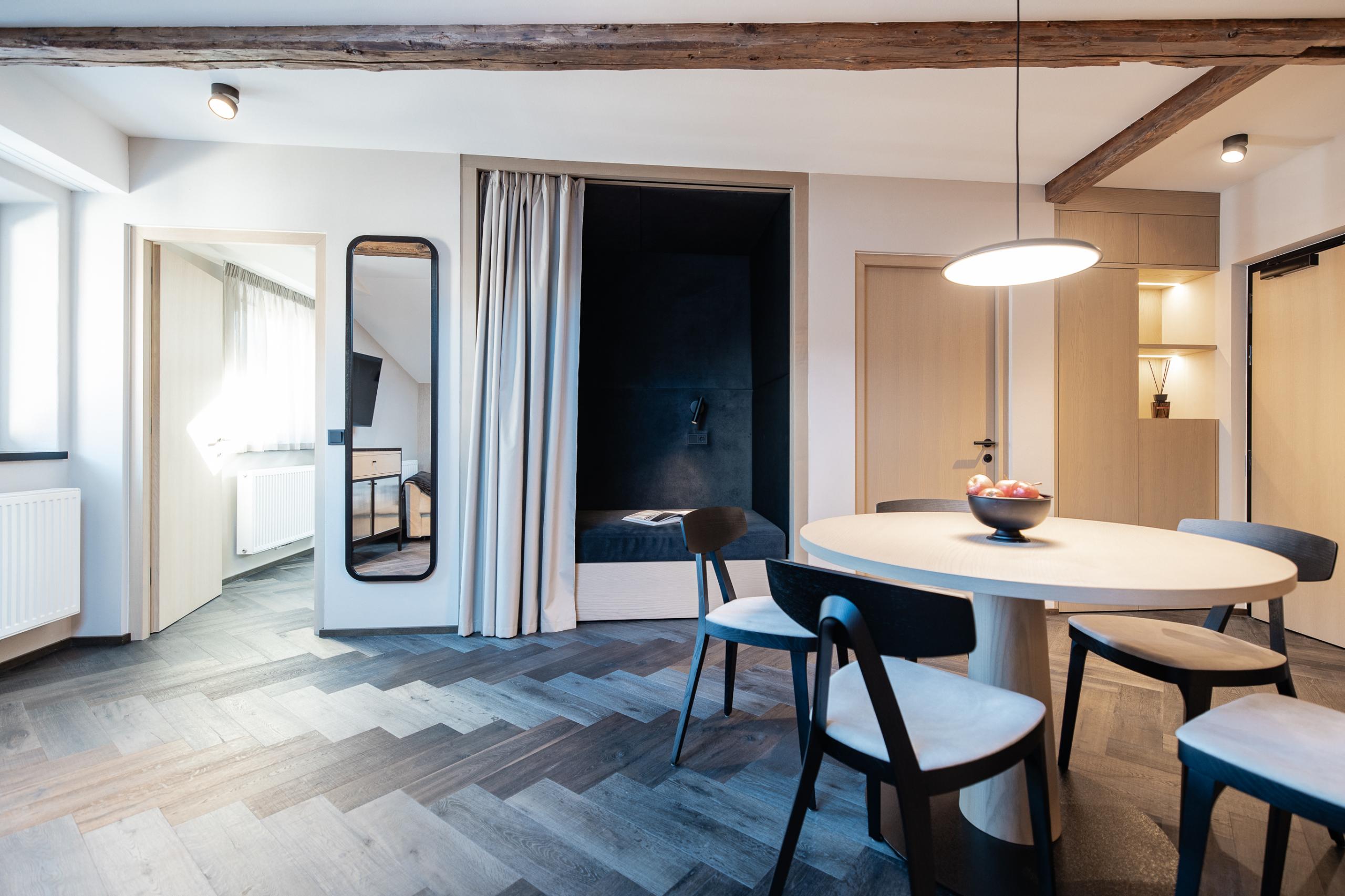 Biancheria da letto e asciugamani di alta qualità | Borsa wellness con accappatoio, ciabatte e teli sauna | Prodotti selezionati della linea cosmetica vegana Element_ry con fico e sandalo | Asciugacapelli | Specchio cosmetico | Smart TV | WiFi | Telefono | Cassaforte | Guestbook digitale | Edicola online