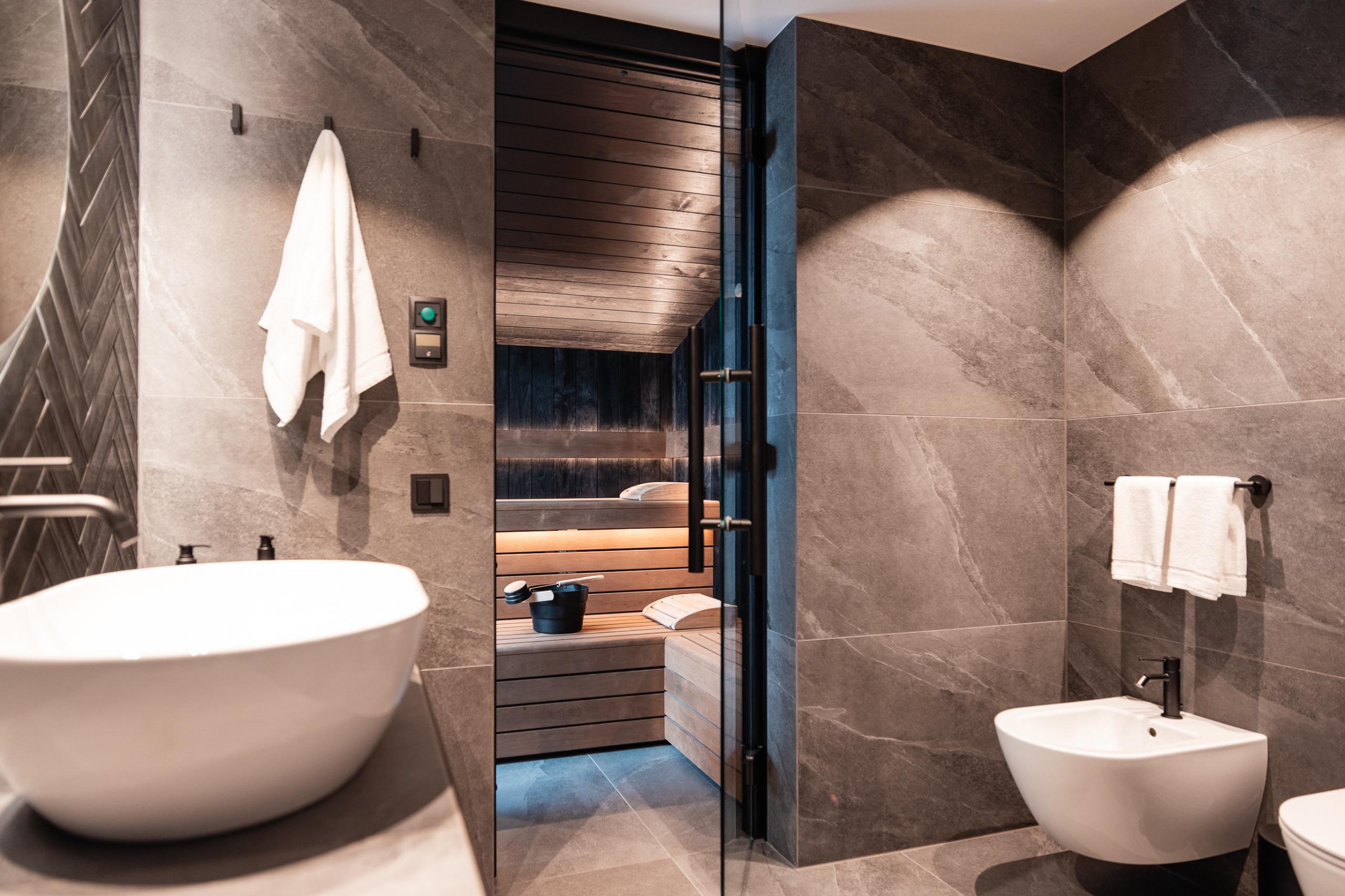 Soggiorno e camera da letto separati | Letto king-size | Sauna privata con parete in vetro | Nel soggiorno divano letto per due persone e angolo relax | Scrivania | Cucina completamente attrezzata con tavolo da pranzo | Armadio e guardaroba con panca | Doccia | WC | Bidet